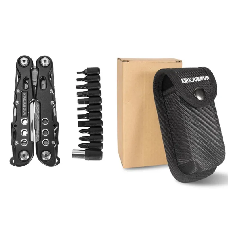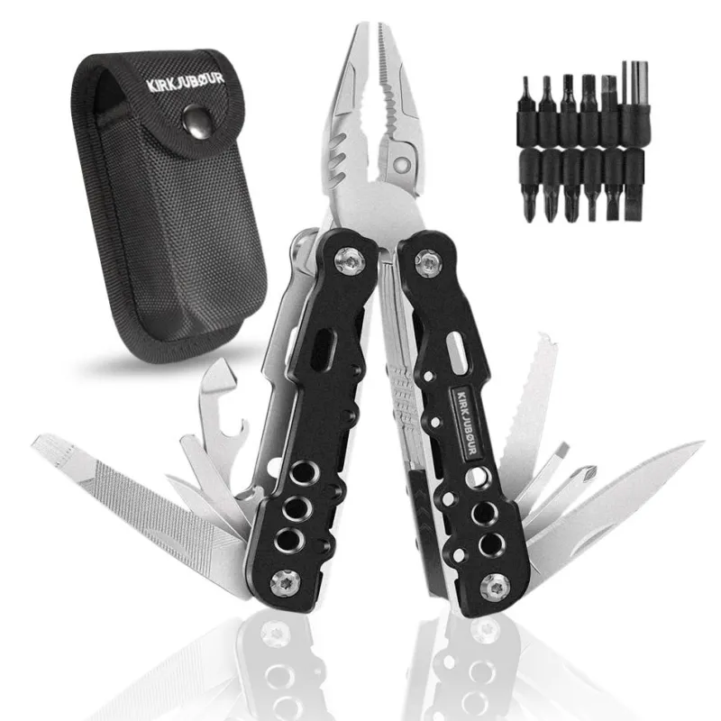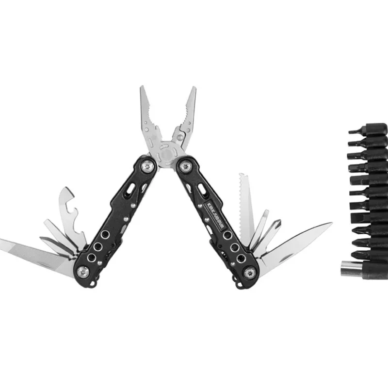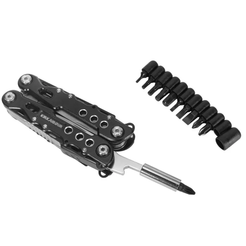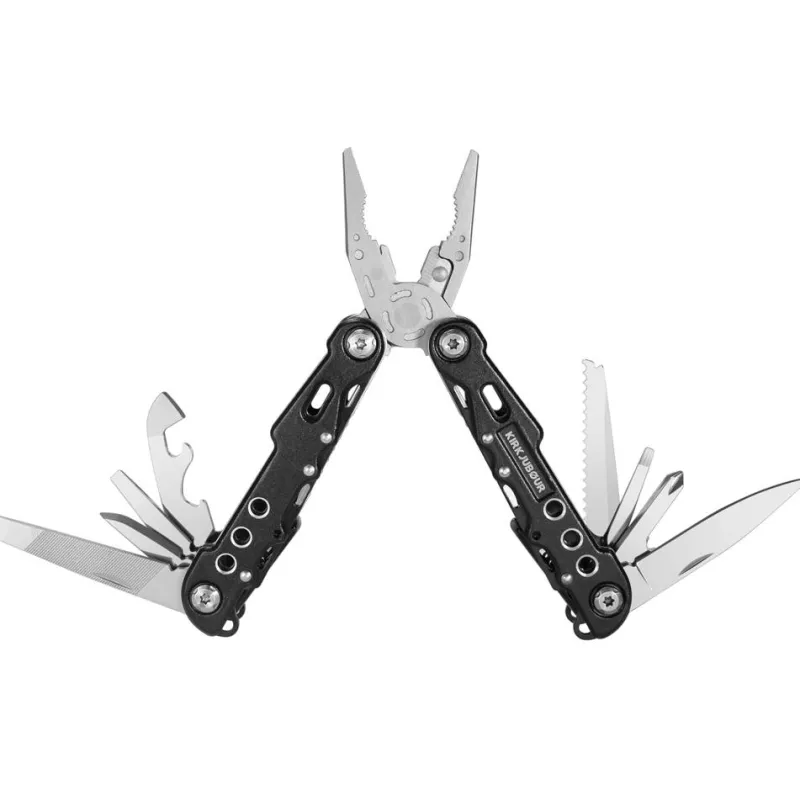 - Herramienta compuesta por: alicates de punta fina, alicates normales, cortacables, sierra, quitaganchos, destornillador grande, cuchillo multifunción, destornillador plano, destornillador Phillips, destapador de botellas, abrelatas, destornillador plano grande, destornillador plano, lima metálica