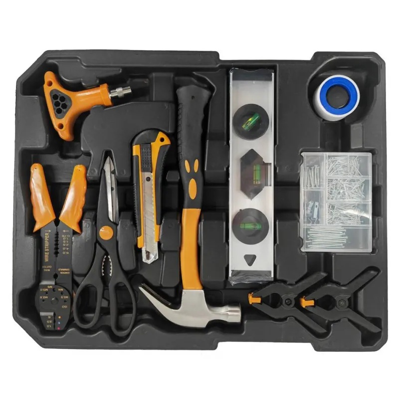 - Martillo, nivel de burbuja, cúter, tijeras, alicates de crimpeado, cinta aislante, tornillos, clavos, bridas, grapas y tachuelas.