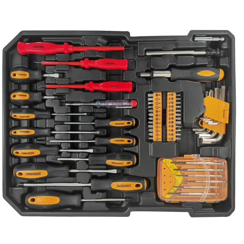 - 6 destornilladores de punta plana (1 totalmente aislado), 7 destornilladores Phillips (2 totalmente aislados), comprobador de voltaje, destornillador de trinquete con 2 juegos de puntas y portapuntas, destornillador de precisión, pasador neumático, llave hexagonal