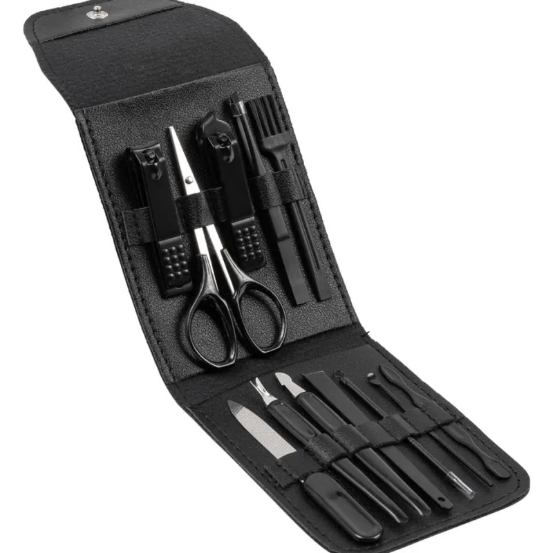 - Conjunto contiene tijeras, pinzas, cortacutículas, cortaúñas pequeño, limpiador de uñas, lima de uñas, cepillo para limpieza de uñas, aguja para acné, eliminador de callos planos, limpiador de oídos y estuche.