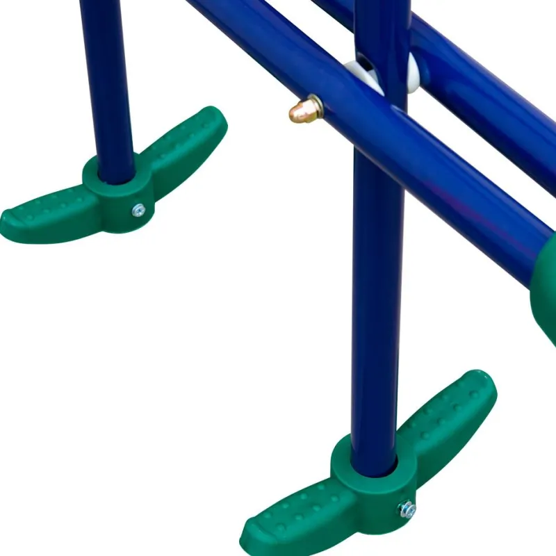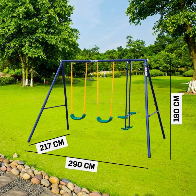 - Incluido en la entrega: 2x columpios individuales, 1x balancín, 1x estructura, 4x anclajes al suelo y 1x instrucciones de montaje