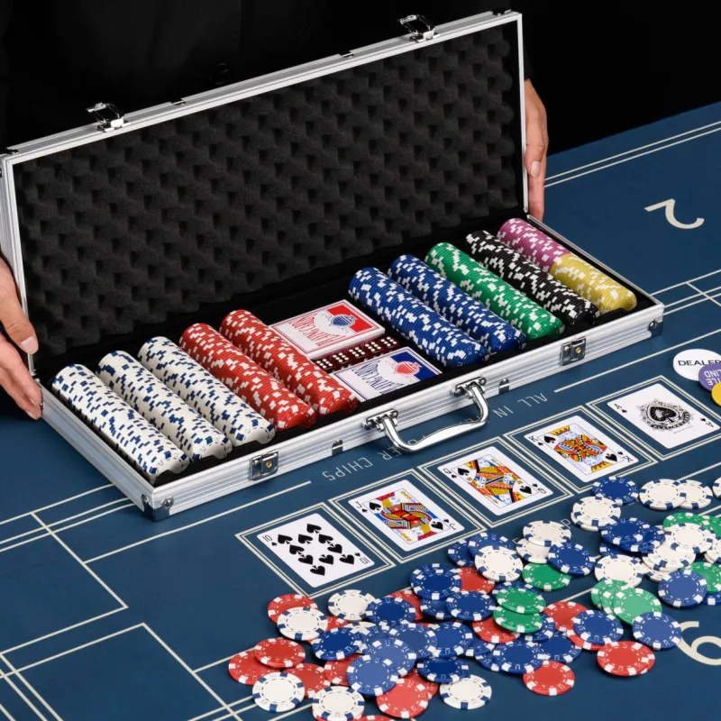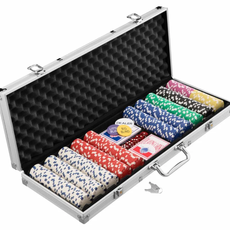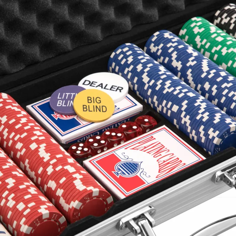 - Conjunto compuesto por un maletín de póquer con 500 fichas láser, 1 botón de repartidor, 1 botón de «ciega pequeña» y 1 botón de «ciega grande», 5 dados de casino, 2 barajas Baraja de cartas 54 piezas cada una